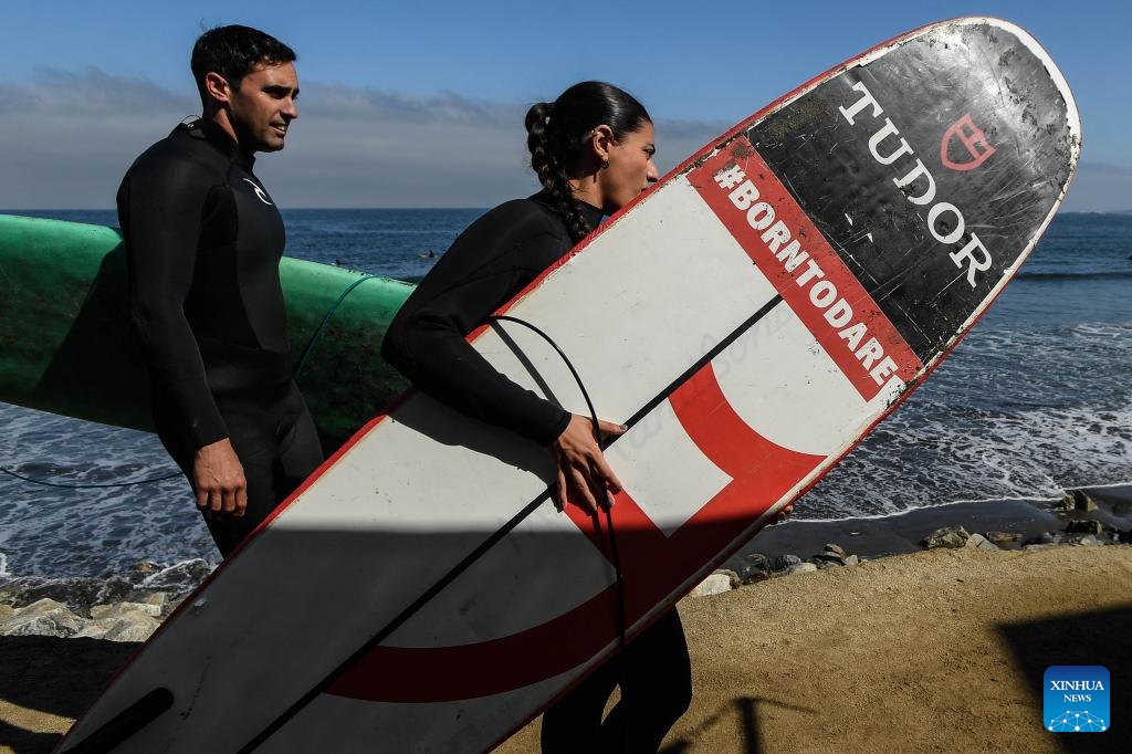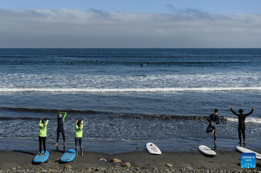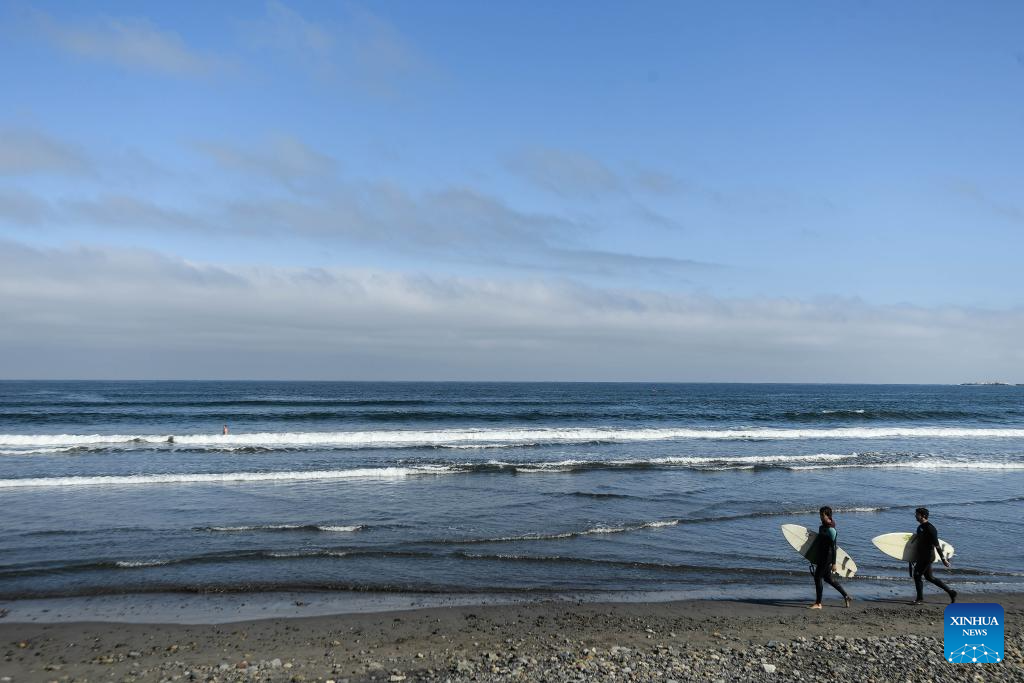 CONCON, 16 febrero, 2025 (Xinhua) -- Personas se preparan para surfear en una playa durante la temporada estival, en la comuna de Concón, en la región de Valparaíso, Chile, el 16 de febrero de 2025. (Xinhua/Jorge Villegas)