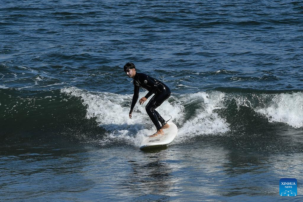 CONCON, 16 febrero, 2025 (Xinhua) -- Una persona practica surf durante la temporada estival, en la comuna de Concón, en la región de Valparaíso, Chile, el 16 de febrero de 2025. (Xinhua/Jorge Villegas)
