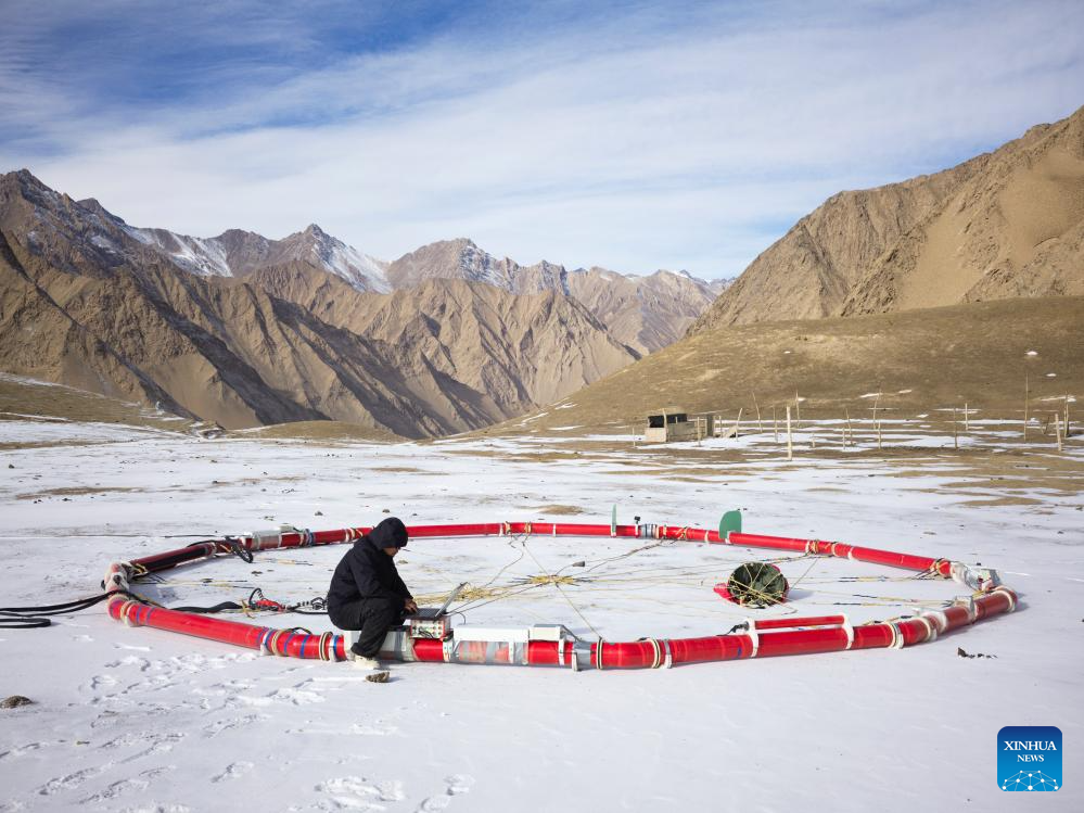 BEIJING, 18 febrero, 2025 (Xinhua) -- Imagen del 11 de enero de 2025 de un investigador probando el sistema de detección magnetotelúrico aerotransportado por helicóptero, en Hetian, en la región autónoma uygur de Xinjiang, en el noroeste de China. El primer sistema de detección magnetotelúrico aerotransportado por helicóptero de China se ha aplicado con éxito a un proyecto de construcción ferroviaria en una meseta, informó el martes el Instituto de Investigación de Información Aeroespacial (AIR, por sus siglas en inglés) de la Academia de Ciencias de China. (Xinhua/Guo Feng)