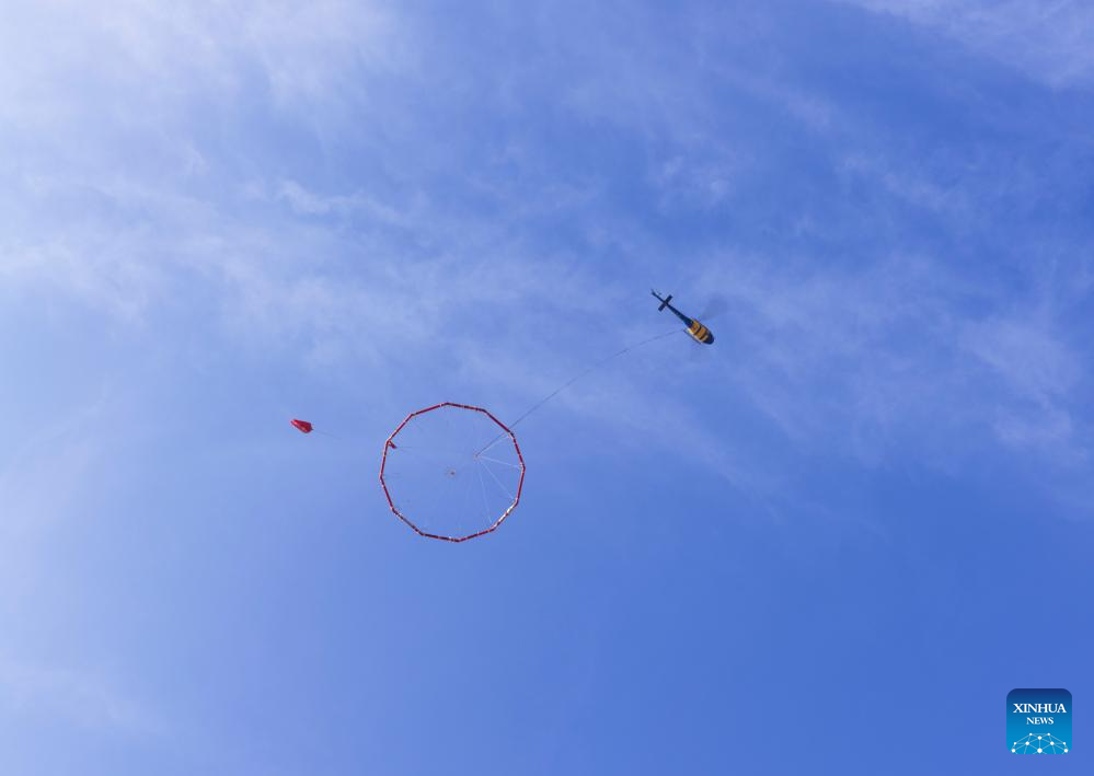 BEIJING, 18 febrero, 2025 (Xinhua) -- Imagen del 10 de enero de 2025 del sistema de detección magnetotelúrico aerotransportado por helicóptero funcionando en Hetian, en la región autónoma uygur de Xinjiang, en el noroeste de China. El primer sistema de detección magnetotelúrico aerotransportado por helicóptero de China se ha aplicado con éxito a un proyecto de construcción ferroviaria en una meseta, informó el martes el Instituto de Investigación de Información Aeroespacial (AIR, por sus siglas en inglés) de la Academia de Ciencias de China. (Xinhua/Guo Feng)