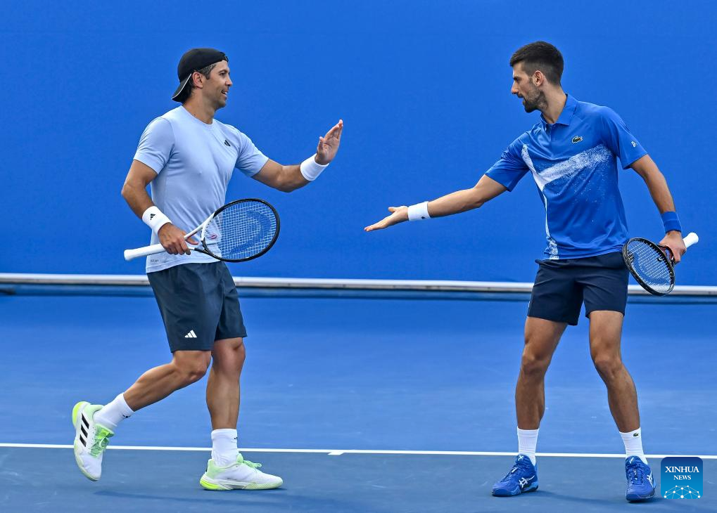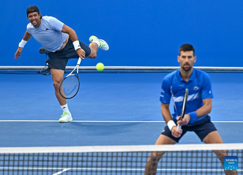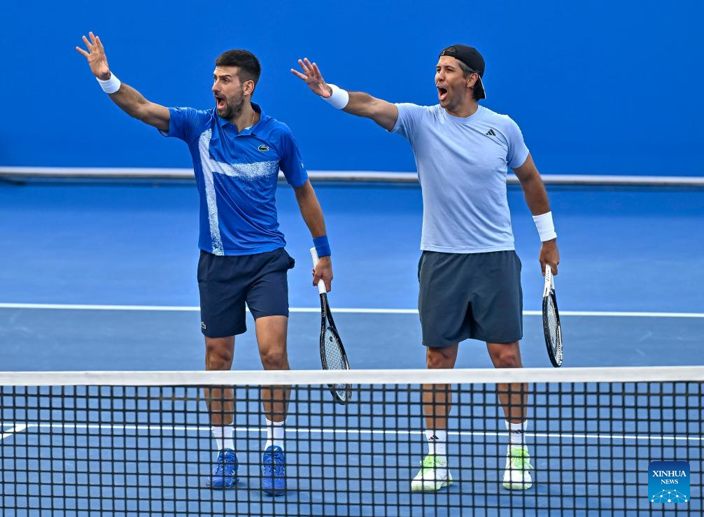 DOHA, 18 febrero, 2025 (Xinhua) -- Imagen del 17 de febrero de 2025 de Novak Djokovic/Fernando Verdasco (i) compitiendo durante el partido de octavos de final de dobles masculinos entre Alexander Bublik, de Kazajistán/Karen Khachanov, de Rusia, y Novak Djokovic, de Serbia/Fernando Verdasco, de España, en el torneo de tenis Abierto de Qatar de la ATP, en Doha, Qatar. (Xinhua/Nikku)