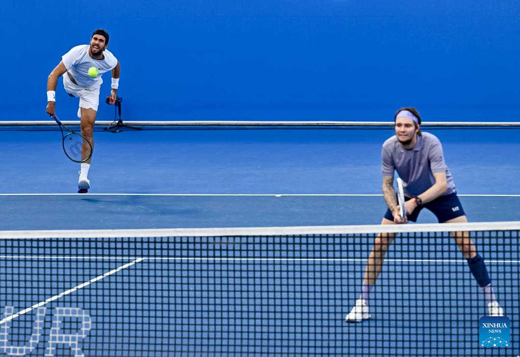 DOHA, 18 febrero, 2025 (Xinhua) -- Imagen del 17 de febrero de 2025 de Alexander Bublik/Karen Khachanov (i) compitiendo durante el partido de octavos de final de dobles masculinos entre Alexander Bublik, de Kazajistán/Karen Khachanov, de Rusia, y Novak Djokovic, de Serbia/Fernando Verdasco, de España, en el torneo de tenis Abierto de Qatar de la ATP, en Doha, Qatar. (Xinhua/Nikku)