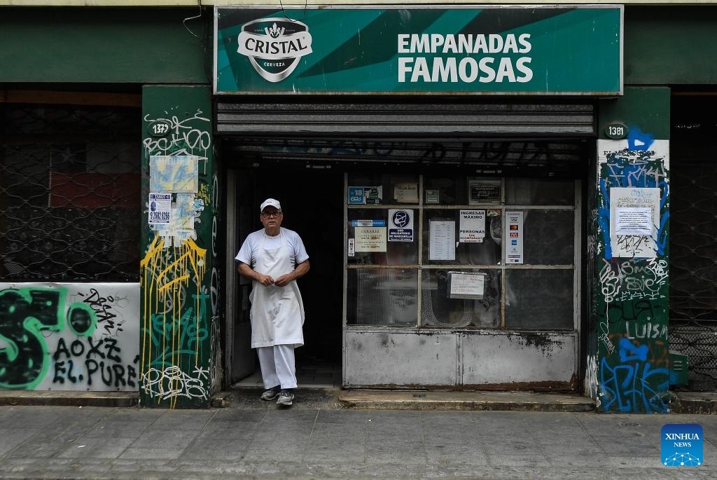 VALPARAISO, 18 febrero, 2025 (Xinhua) -- Un hombre sale de una tienda de empanadas, en la ciudad de Valparaíso, Chile, el 18 de febrero de 2025. (Xinhua/Jorge Villegas)