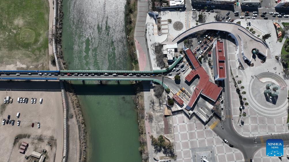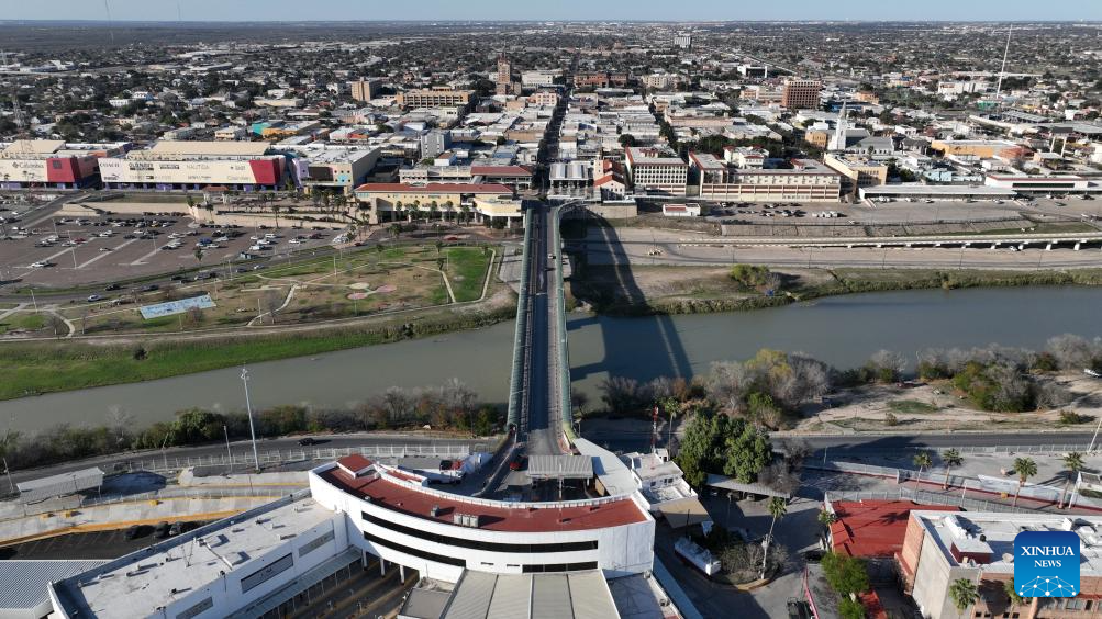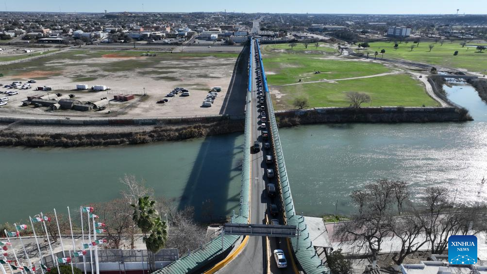 TAMAULIPAS, 18 febrero, 2025 (Xinhua) -- Vista aérea tomada con un dron el 16 de febrero de 2025 de un puente internacional entre México (frente) y Estados Unidos, en Nuevo Laredo, Tamaulipas, México. México y Estados Unidos comparten una línea fronteriza de más de 3.100 kilómetros, con la sección oriental definida principalmente por el Río Bravo. (Xinhua/Li Mengxin)