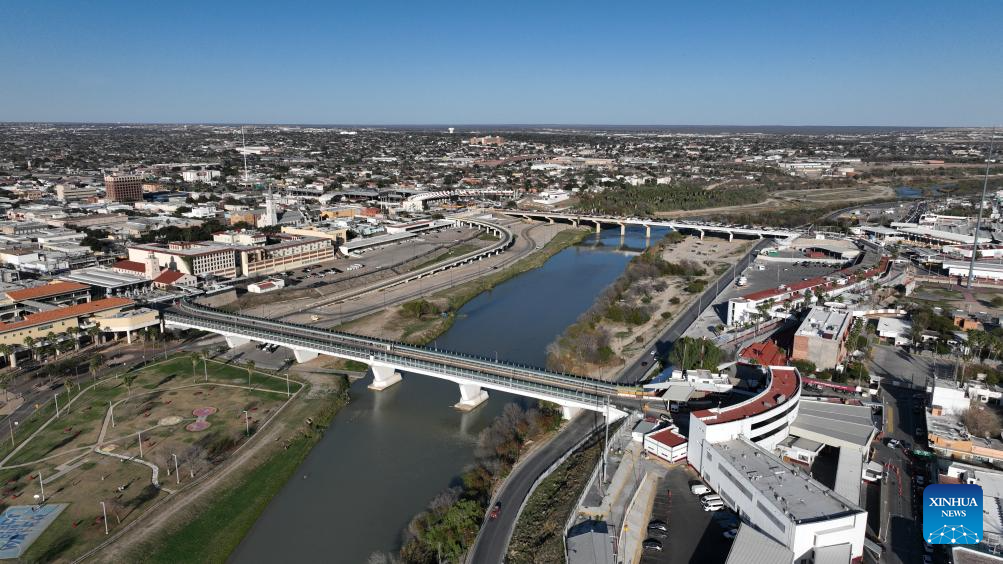 TAMAULIPAS, 18 febrero, 2025 (Xinhua) -- Vista aérea tomada con un dron el 16 de febrero de 2025 de un puente internacional entre México (d) y Estados Unidos, en Nuevo Laredo, Tamaulipas, México. México y Estados Unidos comparten una línea fronteriza de más de 3.100 kilómetros, con la sección oriental definida principalmente por el Río Bravo. (Xinhua/Li Mengxin)