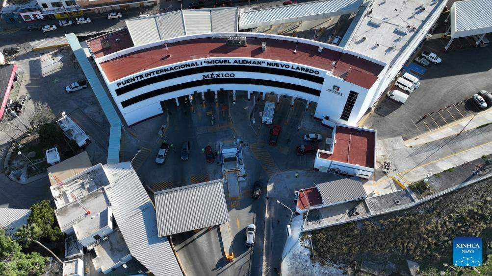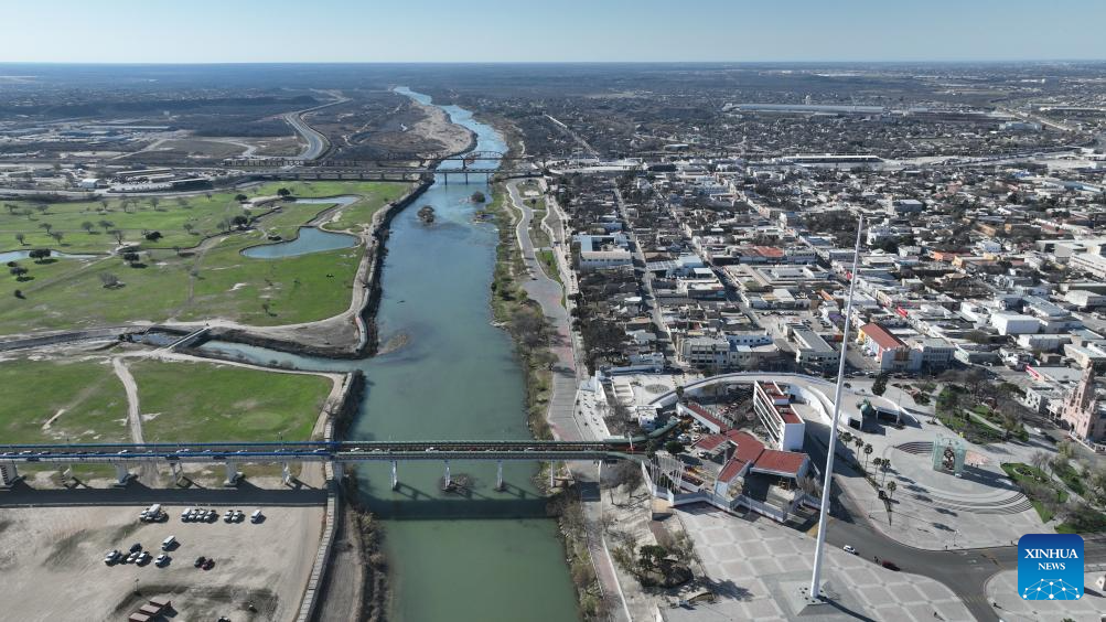 TAMAULIPAS, 18 febrero, 2025 (Xinhua) -- Vista aérea tomada con un dron el 16 de febrero de 2025 de un puesto de control, en Nuevo Laredo, Tamaulipas, México. México y Estados Unidos comparten una línea fronteriza de más de 3.100 kilómetros, con la sección oriental definida principalmente por el Río Bravo. (Xinhua/Li Mengxin)