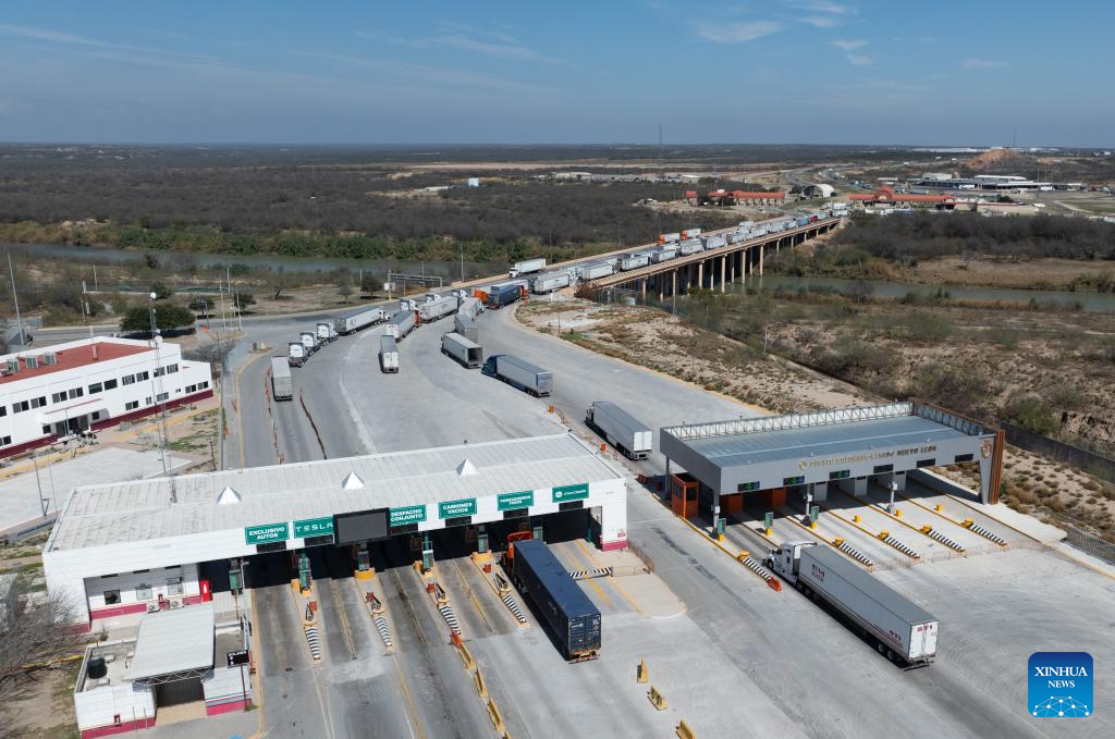 NUEVO LEON, 18 febrero, 2025 (Xinhua) -- Vista aérea tomada con un dron el 15 de febrero de 2025 de camiones pasando por un puesto de control cerca del Puente Internacional Solidaridad Laredo-Colombia, en la comunidad de Colombia, Nuevo León, México. México y Estados Unidos comparten una línea fronteriza de más de 3.100 kilómetros, con la sección oriental definida principalmente por el Río Bravo. (Xinhua/Li Mengxin)
