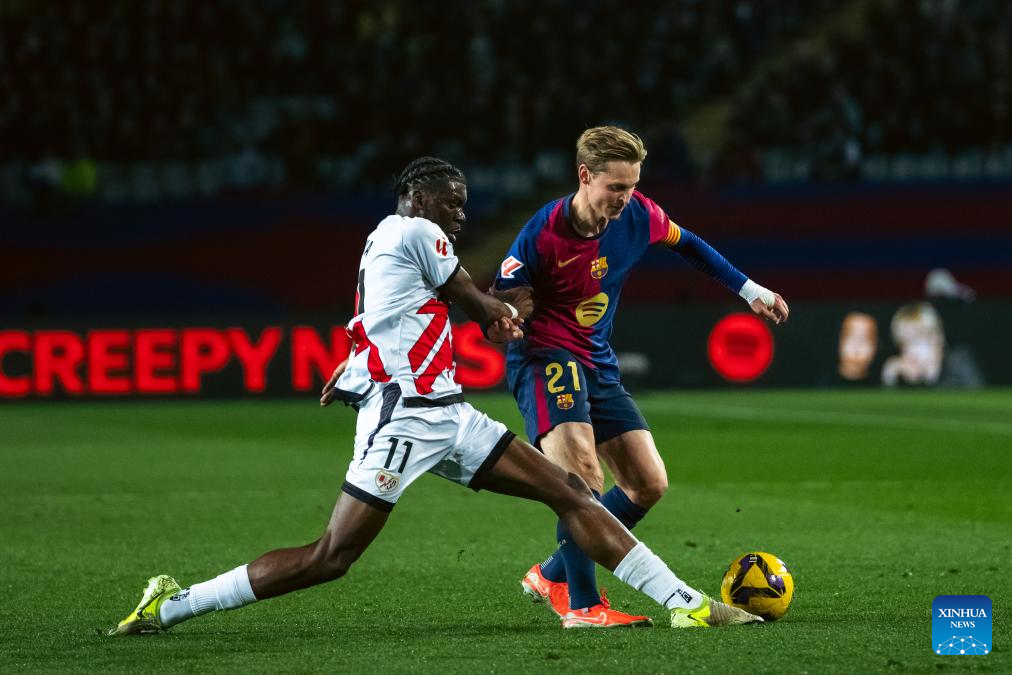 BARCELONA, 18 febrero, 2025 (Xinhua) -- Imagen del 17 de febrero de 2025 de Frenkie De Jong (d), de Barcelona, disputando el balón con Randy Nteka, de Rayo Vallecano, durante el partido de fútbol de LaLiga entre FC Barcelona y Rayo Vallecano, en Barcelona, España. (Xinhua/Joan Gosa)