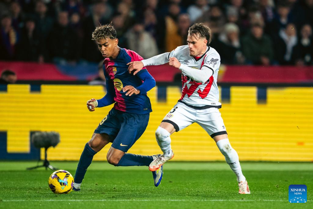 BARCELONA, 18 febrero, 2025 (Xinhua) -- Imagen del 17 de febrero de 2025 de Lamine Yamal (i), de Barcelona, disputando el balón con Pep Chavarría, de Rayo Vallecano, durante el partido de fútbol de LaLiga entre FC Barcelona y Rayo Vallecano, en Barcelona, España. (Xinhua/Joan Gosa)
