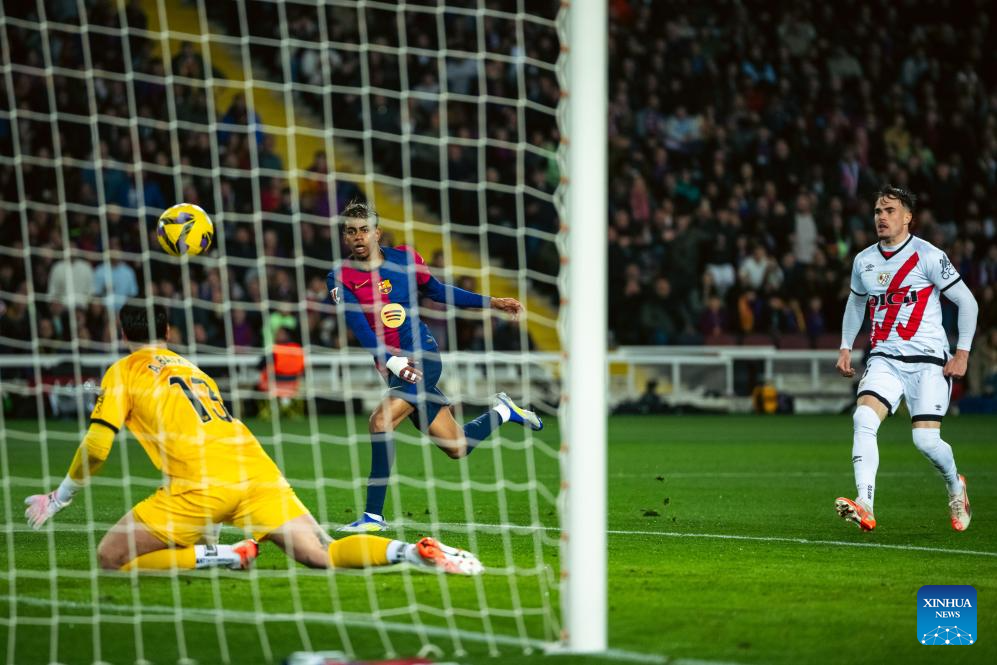 BARCELONA, 18 febrero, 2025 (Xinhua) -- Imagen del 17 de febrero de 2025 de Lamine Yamal (c), de Barcelona, realizando una anotación durante el partido de fútbol de LaLiga entre FC Barcelona y Rayo Vallecano, en Barcelona, España. (Xinhua/Joan Gosa)