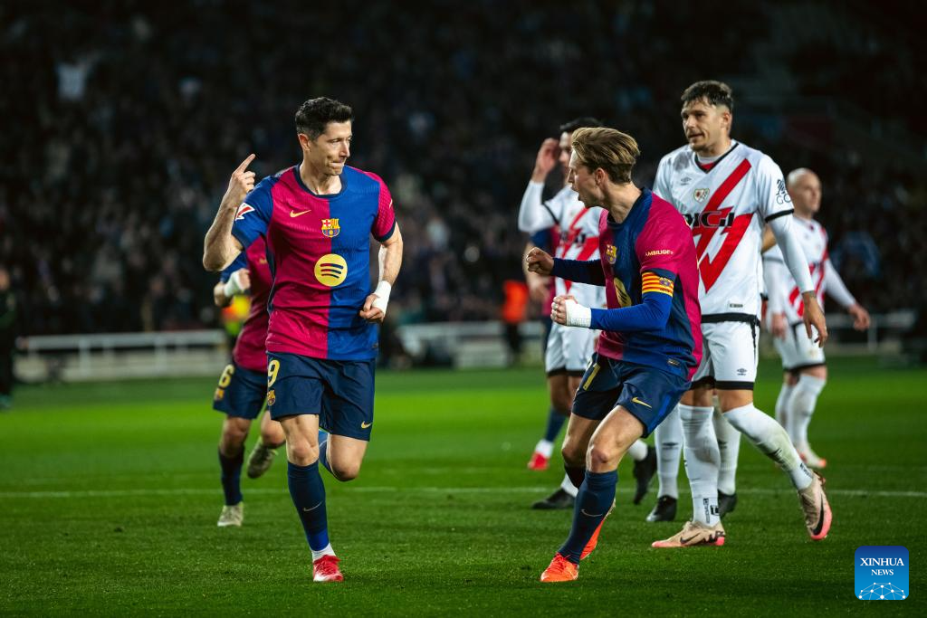 BARCELONA, 18 febrero, 2025 (Xinhua) -- Imagen del 17 de febrero de 2025 de Robert Lewandowski (i), de Barcelona, festejando su anotación durante el partido de fútbol de LaLiga entre FC Barcelona y Rayo Vallecano, en Barcelona, España. (Xinhua/Joan Gosa)