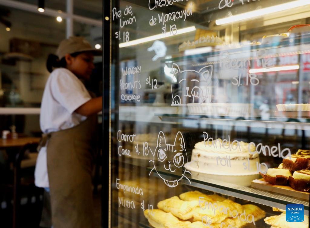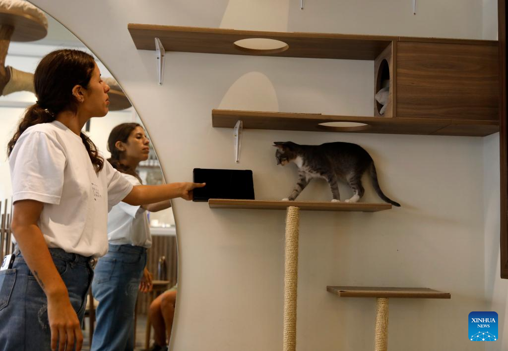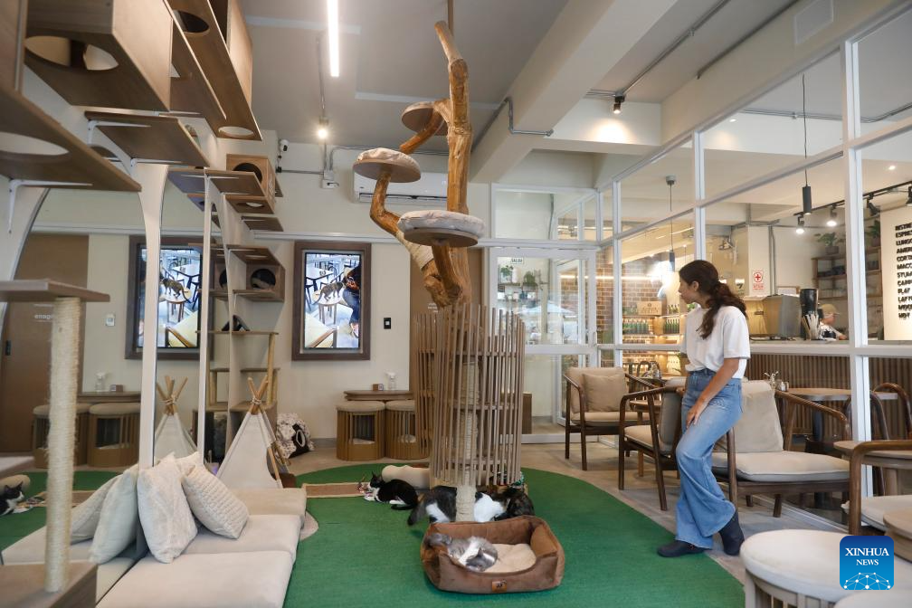 LIMA, 18 febrero, 2025 (Xinhua) -- Una trabajadora labora en Gatú Cat Café, una cafetería con espacios libres para interactuar con gatos y promover adopciones responsables, previo a la celebración del Día Internacional del Gato que se celebra el 20 de febrero, en el distrito de Miraflores, en Lima, Perú, el 18 de febrero de 2025. (Xinhua/Mariana Bazo)