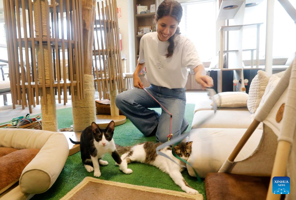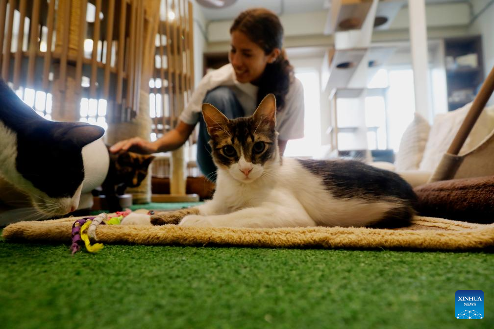 LIMA, 18 febrero, 2025 (Xinhua) -- La trabajadora Valentina Salinas juega con gatos que están en adopción en Gatú Cat Café, una cafetería con espacios libres para interactuar con gatos y promover adopciones responsables, previo a la celebración del Día Internacional del Gato que se celebra el 20 de febrero, en el distrito de Miraflores, en Lima, Perú, el 18 de febrero de 2025. (Xinhua/Mariana Bazo)