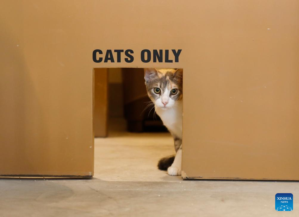 LIMA, 18 febrero, 2025 (Xinhua) -- La trabajadora Valentina Salinas observa gatos que están en adopción en Gatú Cat Café, una cafetería con espacios libres para interactuar con gatos y promover adopciones responsables, previo a la celebración del Día Internacional del Gato que se celebra el 20 de febrero, en el distrito de Miraflores, en Lima, Perú, el 18 de febrero de 2025. (Xinhua/Mariana Bazo)