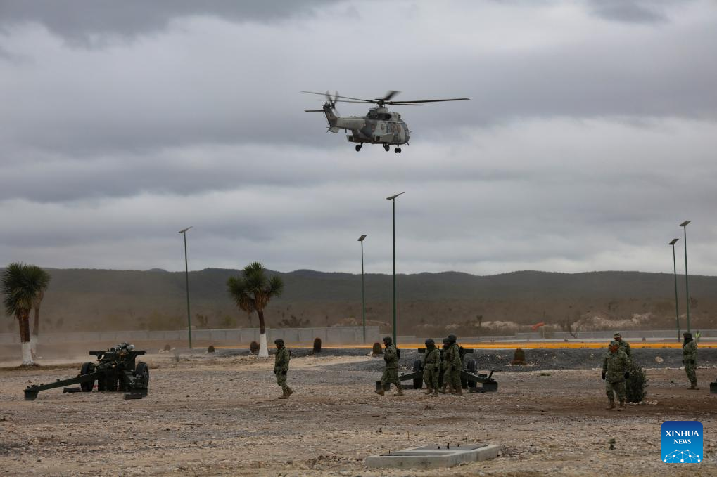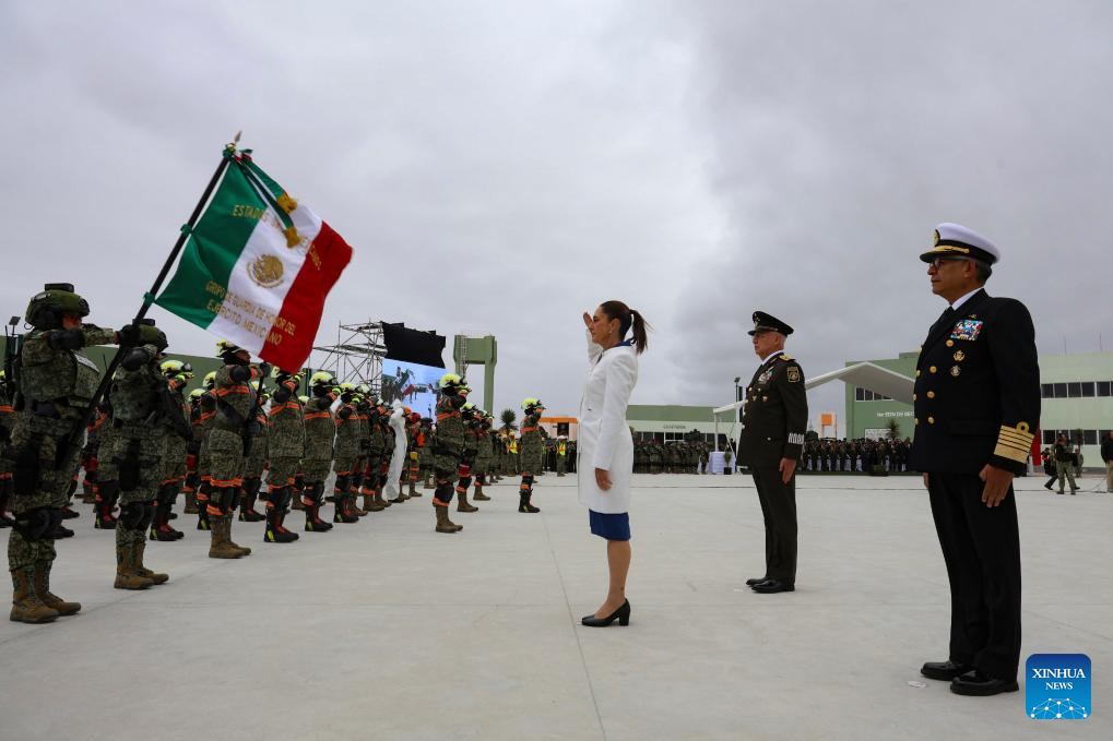 NUEVO LEON, 19 febrero, 2025 (Xinhua) -- Imagen cedida por la Presidencia de México de elementos del Ejército mexicano participando en la inauguración del 27° Regimiento de Caballería Motorizado, en el municipio de Cerralvo, en el estado de Nuevo León, en el norte de México, el 19 de febrero de 2025. La presidenta mexicana, Claudia Sheinbaum, convocó el miércoles a la unidad nacional para poder enfrentar "cualquier adversidad" que se presente, en el marco del 112 Aniversario del Ejército Mexicano. (Xinhua/Presidencia de México)