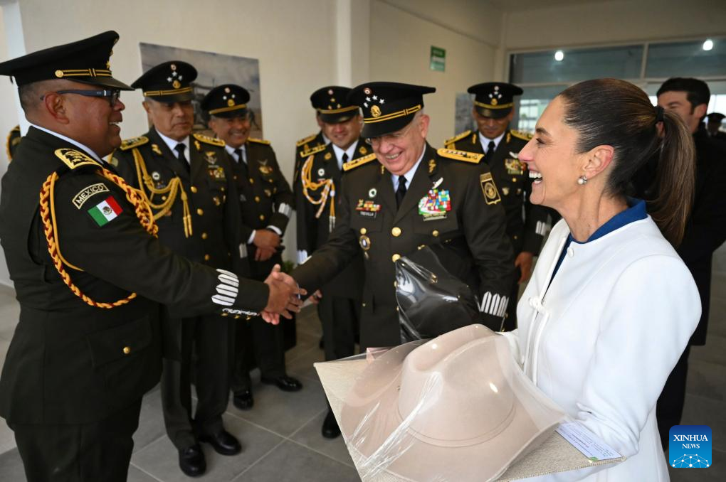 NUEVO LEON, 19 febrero, 2025 (Xinhua) -- Imagen cedida por la Presidencia de México de la presidenta mexicana, Claudia Sheinbaum (d), asistiendo a la inauguración del 27° Regimiento de Caballería Motorizado, en el municipio de Cerralvo, en el estado de Nuevo León, en el norte de México, el 19 de febrero de 2025. Sheinbaum convocó el miércoles a la unidad nacional para poder enfrentar "cualquier adversidad" que se presente, en el marco del 112 Aniversario del Ejército Mexicano. (Xinhua/Presidencia de México)
