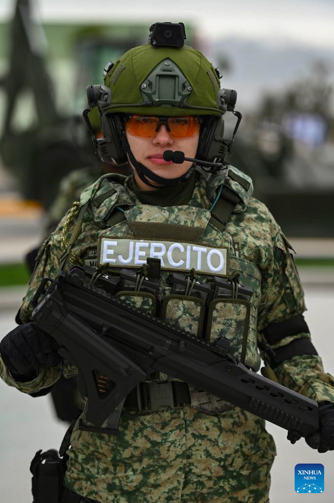 NUEVO LEON, 19 febrero, 2025 (Xinhua) -- Imagen cedida por la Presidencia de México de un elemento del Ejército mexicano participando en la inauguración del 27° Regimiento de Caballería Motorizado, en el municipio de Cerralvo, en el estado de Nuevo León, en el norte de México, el 19 de febrero de 2025. La presidenta mexicana, Claudia Sheinbaum, convocó el miércoles a la unidad nacional para poder enfrentar "cualquier adversidad" que se presente, en el marco del 112 Aniversario del Ejército Mexicano. (Xinhua/Presidencia de México)