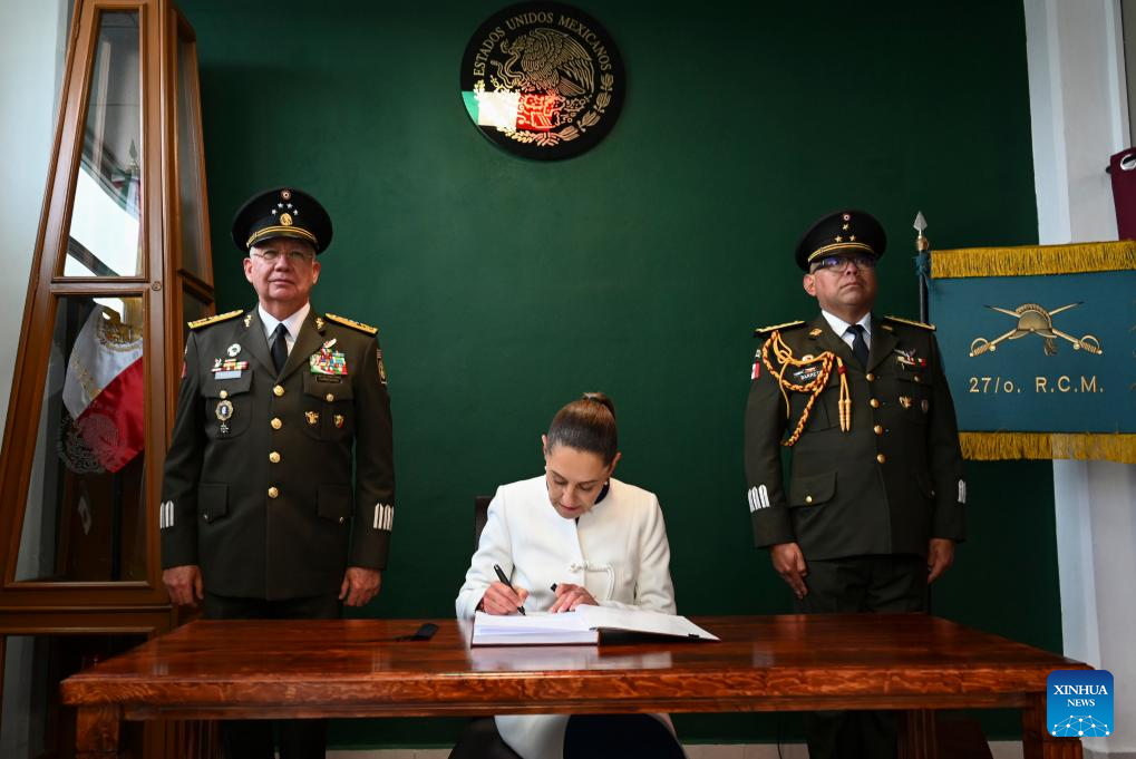 NUEVO LEON, 19 febrero, 2025 (Xinhua) -- Imagen cedida por la Presidencia de México de la presidenta mexicana, Claudia Sheinbaum (c), firmando un documento durante la inauguración del 27° Regimiento de Caballería Motorizado, en el municipio de Cerralvo, en el estado de Nuevo León, en el norte de México, el 19 de febrero de 2025. Sheinbaum convocó el miércoles a la unidad nacional para poder enfrentar "cualquier adversidad" que se presente, en el marco del 112 Aniversario del Ejército Mexicano. (Xinhua/Presidencia de México)