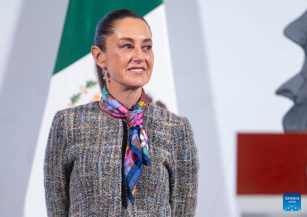 CIUDAD DE MEXICO, 21 febrero, 2025 (Xinhua) -- Imagen cedida por la Presidencia de México de la presidenta mexicana, Claudia Sheinbaum, participando durante su conferencia de prensa matutina, en Palacio Nacional, en la Ciudad de México, capital de México, el 21 de febrero de 2025. Sheinbaum advirtió el viernes que los extranjeros que lleven a cabo actividades de seguridad sin autorización enfrentaran severas sanciones y prisión inmediata. (Xinhua/Presidencia de México)