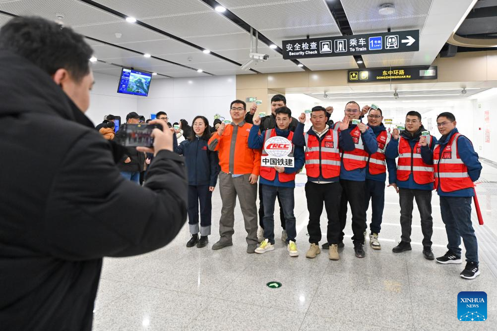 TAIYUAN, 22 febrero, 2025 (Xinhua) -- Algunos de los constructores de la Línea 1 de Tránsito Ferroviario de Taiyuan posan para una fotografía grupal en la estación Xutandongjie de la línea, en Taiyuan, en la provincia de Shanxi, en el norte de China, el 22 de febrero de 2025. La Línea 1 de Tránsito Ferroviario de Taiyuan de Shanxi fue inaugurada el sábado. Con una longitud total de 28,737 kilómetros y 24 estaciones, la línea conecta múltiples ferrocarriles, autopistas y centros de aviación. (Xinhua/Yang Chenguang)