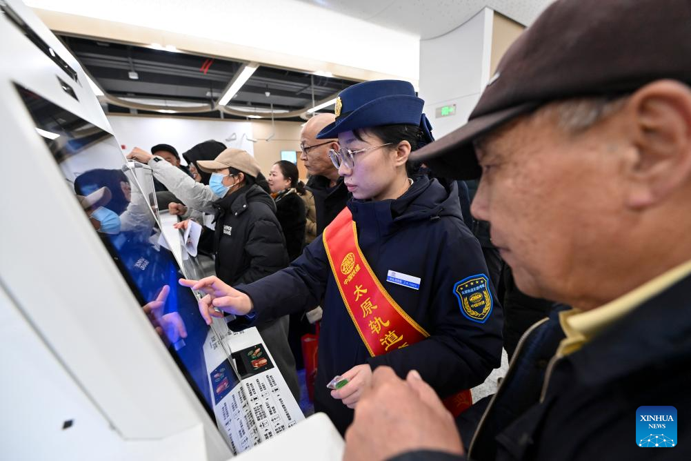 TAIYUAN, 22 febrero, 2025 (Xinhua) -- Una trabajadora ayuda a un pasajero a comprar un boleto en la estación Xutandongjie de la Línea 1 de Tránsito Ferroviario de Taiyuan, en Taiyuan, en la provincia de Shanxi, en el norte de China, el 22 de febrero de 2025. La Línea 1 de Tránsito Ferroviario de Taiyuan de Shanxi fue inaugurada el sábado. Con una longitud total de 28,737 kilómetros y 24 estaciones, la línea conecta múltiples ferrocarriles, autopistas y centros de aviación. (Xinhua/Yang Chenguang)