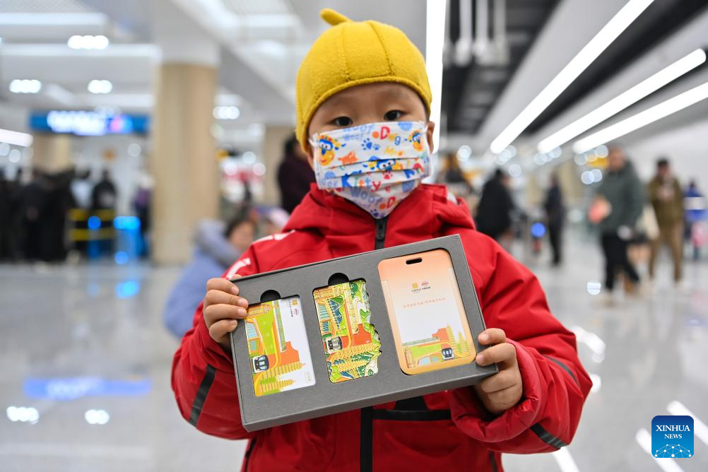 TAIYUAN, 22 febrero, 2025 (Xinhua) -- Un niño muestra un juego de tarjetas de boletos conmemorativas de la inauguración de la Línea 1 de Tránsito Ferroviario de Taiyuan en la estación Xiayuan, en Taiyuan, en la provincia de Shanxi, en el norte de China, el 22 de febrero de 2025. La Línea 1 de Tránsito Ferroviario de Taiyuan de Shanxi fue inaugurada el sábado. Con una longitud total de 28,737 kilómetros y 24 estaciones, la línea conecta múltiples ferrocarriles, autopistas y centros de aviación. (Xinhua/Yang Chenguang)