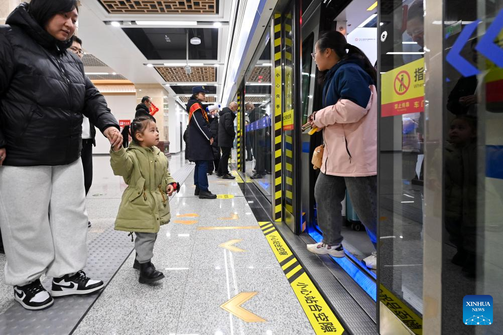 TAIYUAN, 22 febrero, 2025 (Xinhua) -- Una niña y su familia se preparan para abordar un tren de la Línea 1 de Tránsito Ferroviario de Taiyuan en la estación Wuyiguangchang, en Taiyuan, en la provincia de Shanxi, en el norte de China, el 22 de febrero de 2025. La Línea 1 de Tránsito Ferroviario de Taiyuan de Shanxi fue inaugurada el sábado. Con una longitud total de 28,737 kilómetros y 24 estaciones, la línea conecta múltiples ferrocarriles, autopistas y centros de aviación. (Xinhua/Yang Chenguang)