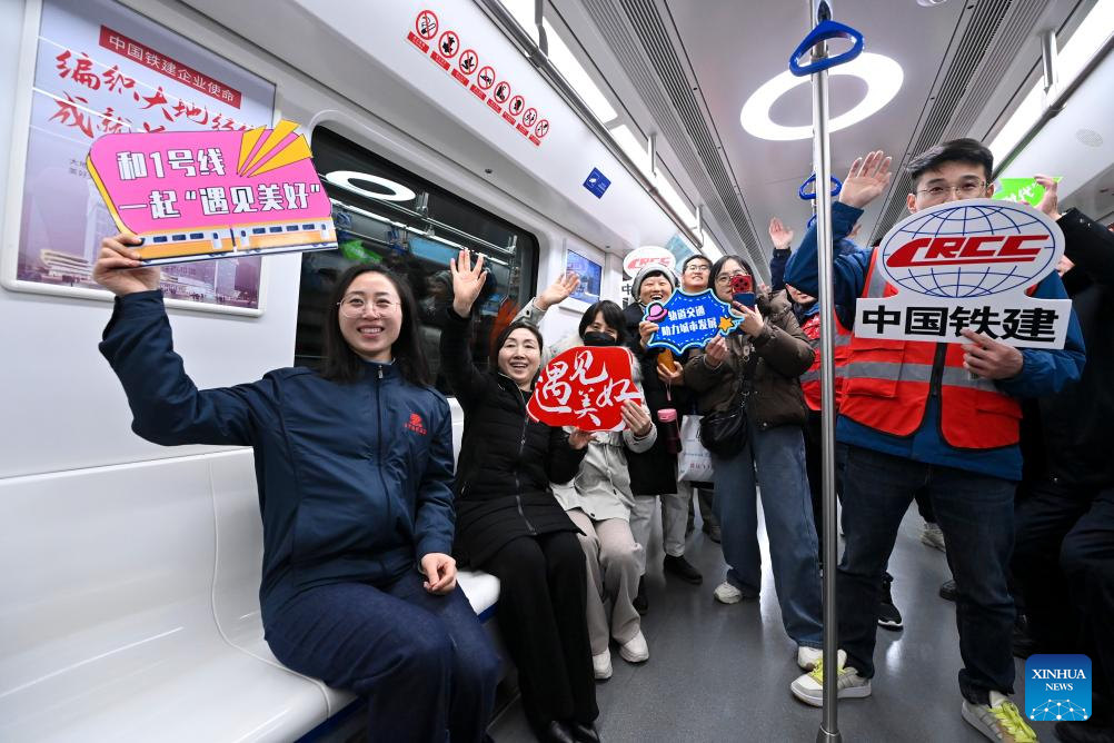 TAIYUAN, 22 febrero, 2025 (Xinhua) -- Algunos de los constructores de la Línea 1 de Tránsito Ferroviario de Taiyuan posan para una fotografía grupal con pasajeros en un tren que circula por la línea, en Taiyuan, en la provincia de Shanxi, en el norte de China, el 22 de febrero de 2025. La Línea 1 de Tránsito Ferroviario de Taiyuan de Shanxi fue inaugurada el sábado. Con una longitud total de 28,737 kilómetros y 24 estaciones, la línea conecta múltiples ferrocarriles, autopistas y centros de aviación. (Xinhua/Yang Chenguang)
