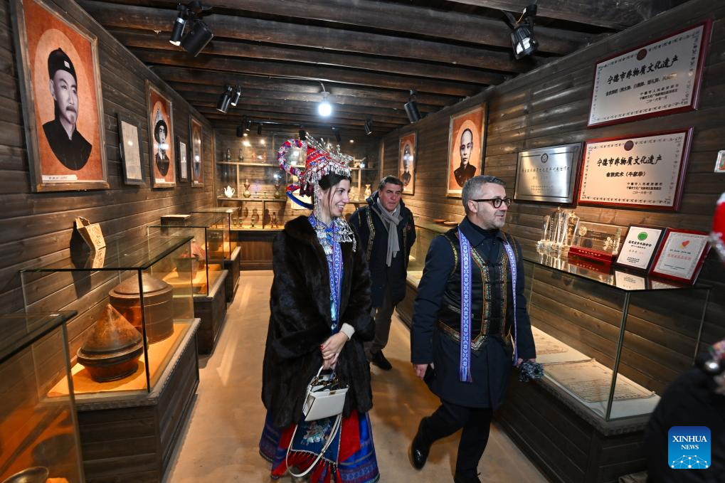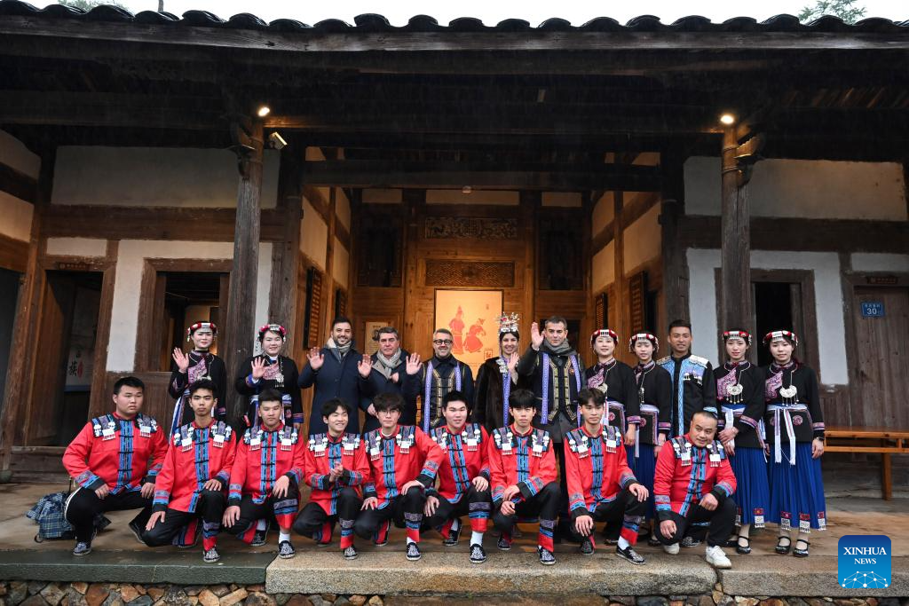 XIAPU, 22 febrero, 2025 (Xinhua) -- Imagen del 20 de febrero de 2025 de invitados italianos visitando un museo que presenta las costumbres populares del grupo étnico she, en la aldea Banyueli, en el poblado de Xinan del distrito de Xiapu, en la provincia de Fujian, en el sureste de China. Una delegación de Cerdeña, Italia, visitó la aldea el jueves, experimentando la cultura y las costumbres únicas del grupo étnico she. (Xinhua/Jiang Kehong)