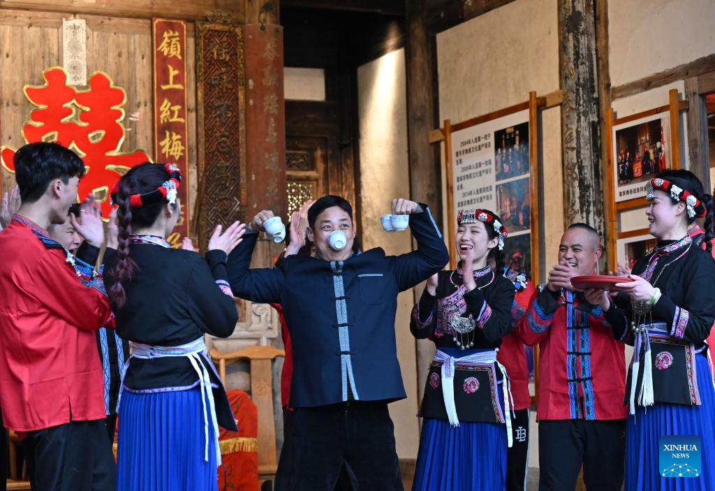 XIAPU, 22 febrero, 2025 (Xinhua) -- Imagen del 20 de febrero de 2025 de aldeanos realizando una presentación de las costumbres nupciales del grupo étnico she para invitados italianos, en la aldea de Banyueli del poblado de Xinan, en el distrito de Xiapu, en la provincia de Fujian, en el sureste de China. Una delegación de Cerdeña, Italia, visitó la aldea el jueves, experimentando la cultura y las costumbres únicas del grupo étnico she. (Xinhua/Jiang Kehong)