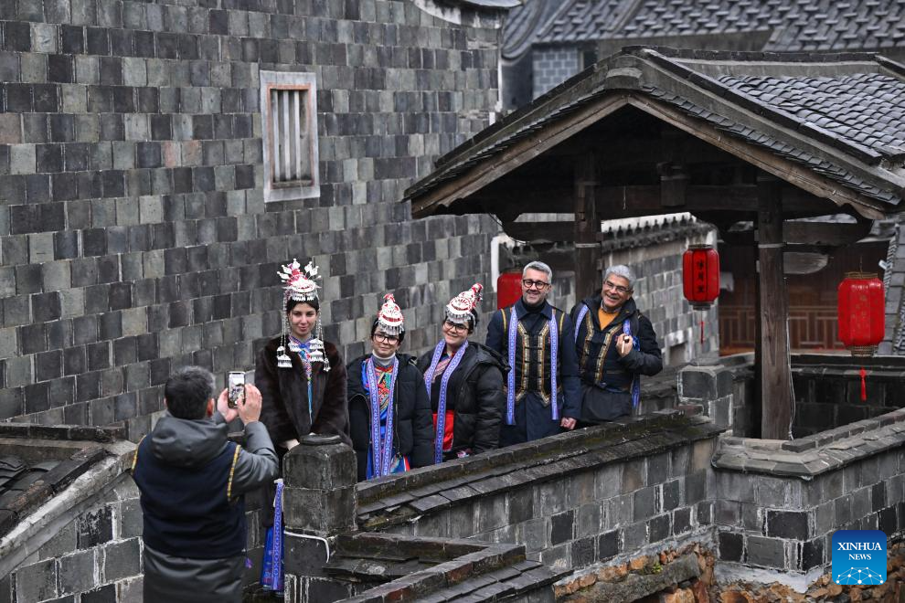 XIAPU, 22 febrero, 2025 (Xinhua) -- Imagen del 20 de febrero de 2025 de invitados italianos posando para fotografías con trajes locales, en la aldea de Banyueli del poblado de Xinan, en el distrito de Xiapu, en la provincia de Fujian, en el sureste de China. Una delegación de Cerdeña, Italia, visitó la aldea el jueves, experimentando la cultura y las costumbres únicas del grupo étnico she. (Xinhua/Jiang Kehong)
