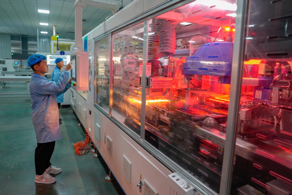TONGXIN, 21 febrero, 2025 (Xinhua) -- Imagen del 20 de febrero de 2025 de trabajadores procesando productos fotovoltaicos en un parque industrial, en el distrito de Tongxin de Wuzhong, en la región autónoma hui de Ningxia, en el noroeste de China. El distrito de Tongxin está cultivando un clúster de energía renovable mediante el desarrollo de un parque industrial, ampliando las cadenas de fabricación ecológica para impulsar el crecimiento sostenible en las regiones áridas. (Xinhua/Yang Zhisen)
