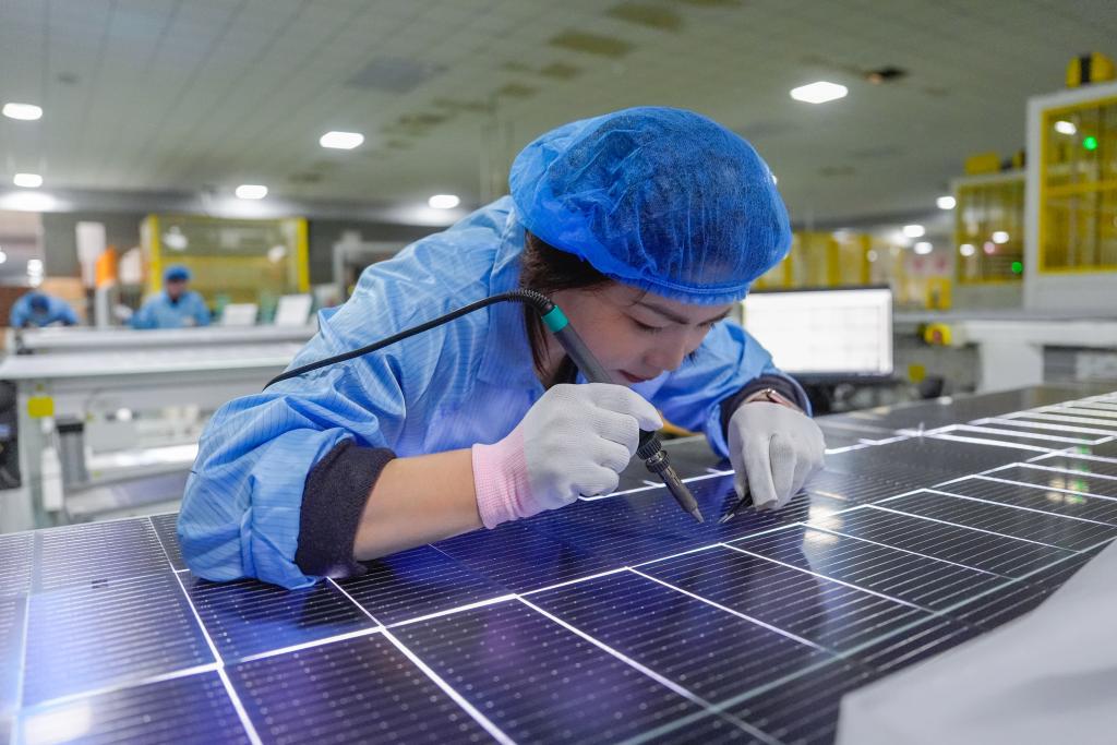 TONGXIN, 21 febrero, 2025 (Xinhua) -- Imagen del 20 de febrero de 2025 de una trabajadora laborando en un panel fotovoltaico en un parque industrial, en el distrito de Tongxin de Wuzhong, en la región autónoma hui de Ningxia, en el noroeste de China. El distrito de Tongxin está cultivando un clúster de energía renovable mediante el desarrollo de un parque industrial, ampliando las cadenas de fabricación ecológica para impulsar el crecimiento sostenible en las regiones áridas. (Xinhua/Yang Zhisen)