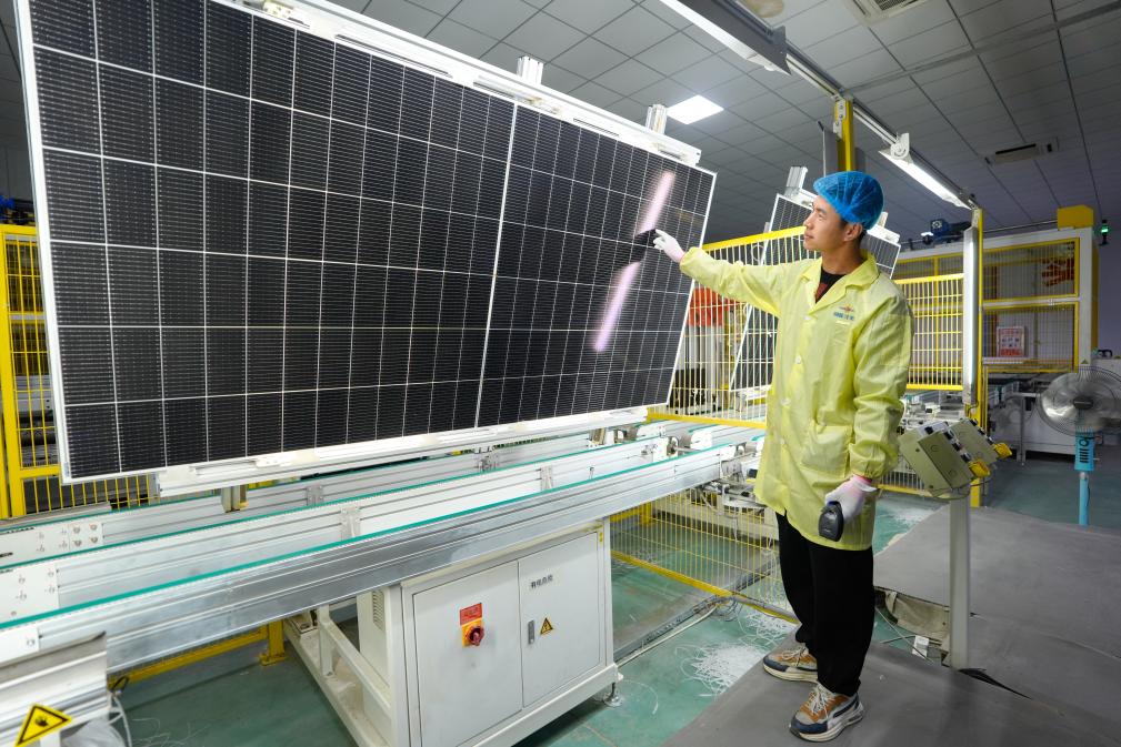 TONGXIN, 21 febrero, 2025 (Xinhua) -- Imagen del 20 de febrero de 2025 de un trabajador revisando un panel fotovoltaico en un parque industrial, en el distrito de Tongxin de Wuzhong, en la región autónoma hui de Ningxia, en el noroeste de China. El distrito de Tongxin está cultivando un clúster de energía renovable mediante el desarrollo de un parque industrial, ampliando las cadenas de fabricación ecológica para impulsar el crecimiento sostenible en las regiones áridas. (Xinhua/Yang Zhisen)