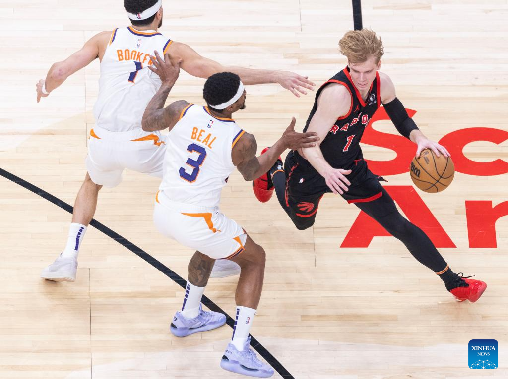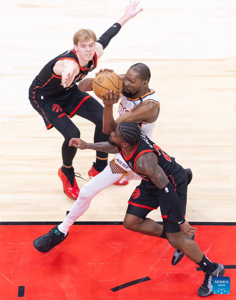 TORONTO, 24 febrero, 2025 (Xinhua) -- Imagen del 23 de febrero de 2025 de Kevin Durant (c), de Phoenix Suns, abriéndose paso durante el partido de la temporada regular 2024-2025 de la NBA entre Toronto Raptors y Phoenix Suns, en Toronto, Canadá. (Xinhua/Zou Zheng)
