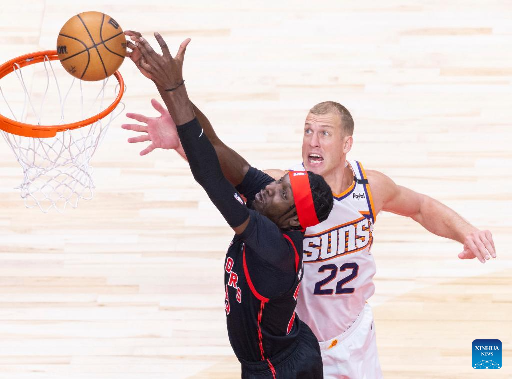 TORONTO, 24 febrero, 2025 (Xinhua) -- Imagen del 23 de febrero de 2025 de Chris Boucher (c), de Toronto Raptors, festejando una anotación durante el partido de la temporada regular 2024-2025 de la NBA entre Toronto Raptors y Phoenix Suns, en Toronto, Canadá. (Xinhua/Zou Zheng)