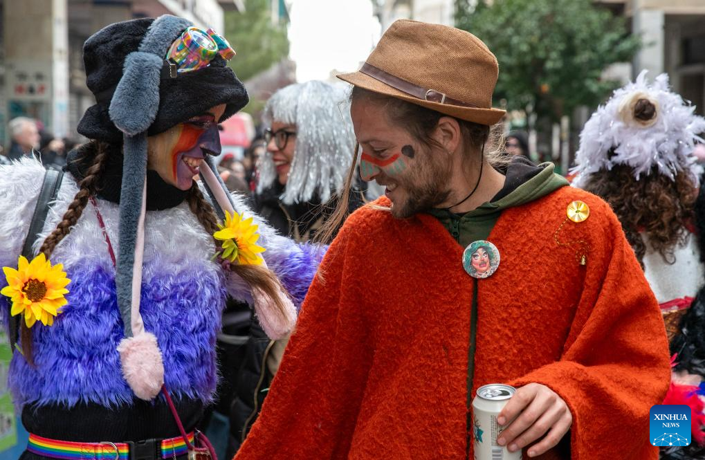ATENAS, 24 febrero, 2025 (Xinhua) -- Imagen del 23 de febrero de 2025 de personas disfrazadas disfrutando de las festividades de carnaval, en Atenas, Grecia. (Xinhua/Marios Lolos)