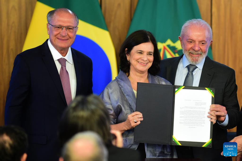 El presidente brasileño, Luiz Inácio Lula da Silva (d), el vicepresidente brasileño, Geraldo Alckmin (i), y la ministra de Salud brasileña, Nísia Trindade (c), posan para una fotografía durante la ceremonia de firma de alianzas para fortalecer la producción e innovación de vacunas y productos biofarmacéuticos, en el Palacio de Planalto, en Brasilia, Brasil, el 25 de febrero de 2025. Lula da Silva anunció el martes un acuerdo para la producción a gran escala de la primera vacuna 100 por ciento nacional de dosis única contra el dengue. (Xinhua/Lucio Tavora)