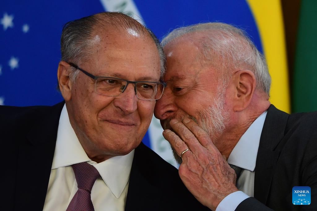 El presidente brasileño, Luiz Inácio Lula da Silva (d), conversa con el vicepresidente brasileño, Geraldo Alckmin (i), durante la ceremonia de firma de alianzas para fortalecer la producción e innovación de vacunas y productos biofarmacéuticos, en el Palacio de Planalto, en Brasilia, Brasil, el 25 de febrero de 2025. Lula da Silva anunció el martes un acuerdo para la producción a gran escala de la primera vacuna 100 por ciento nacional de dosis única contra el dengue. (Xinhua/Lucio Tavora)