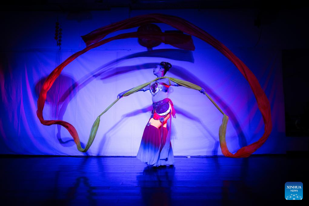 BUENOS AIRES, 26 febrero, 2025 (Xinhua) -- Imagen del 25 de febrero de 2025 de Lina Chen realizando la danza tradicional "En el Sueño de Dunhuang" durante el acto de inicio del calendario académico del Instituto Confucio de la Universidad de Buenos Aires (ICUBA) en el espacio cultural Sábato de la Facultad de Ciencias Económicas de la UBA, en la ciudad de Buenos Aires, capital de Argentina. El ICUBA dio inicio a su calendario académico en el Año de la Serpiente de madera con un emotivo acto cultural, que sirvió como un auspicioso comienzo para este nuevo ciclo. (Xinhua/Martín Zabala)