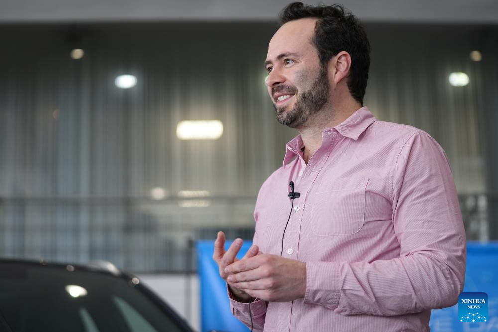 Imagen del 24 de febrero de 2025 del gerente de BYD Autos para Colombia, Nicolás Behar, participando en una entrevista en las instalaciones del fabricante chino de vehículos eléctricos BYD, en la ciudad de Bogotá, Colombia. La empresa automotriz china de alta tecnología BYD ha tomado el liderazgo en el mercado de vehículos eléctricos de Colombia, al introducir 4.590 automóviles entre híbridos y eléctricos en las calles de las ciudades colombianas durante 2024, un crecimiento en ventas del 220 por ciento respecto a 2023. (Xinhua/Andrés Moreno)