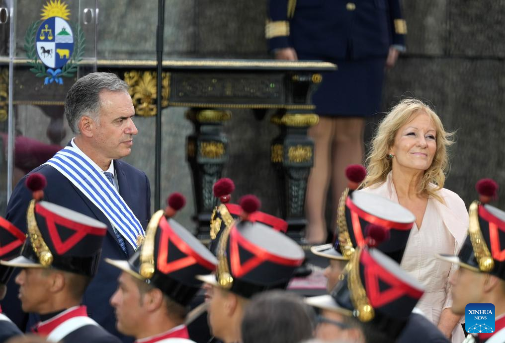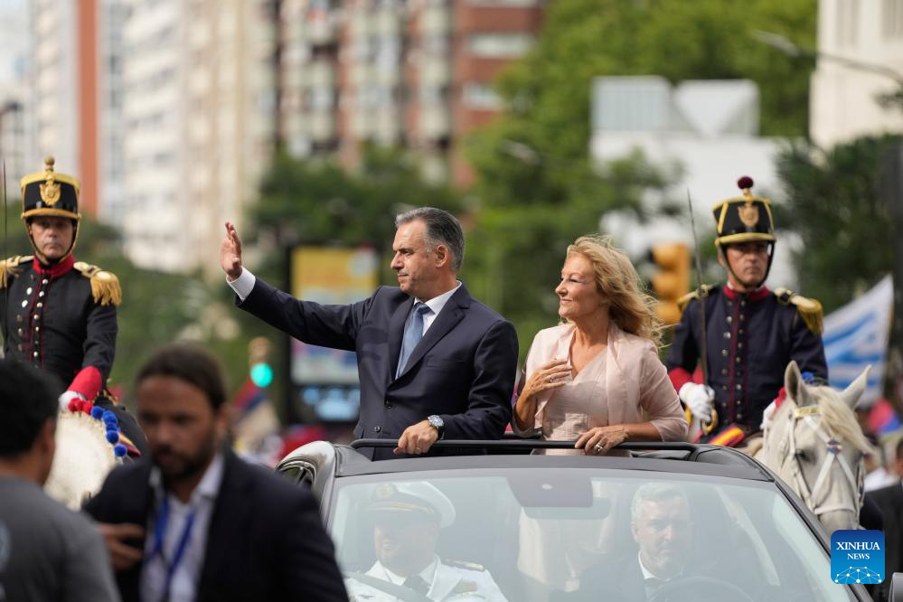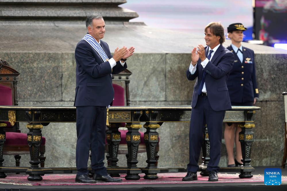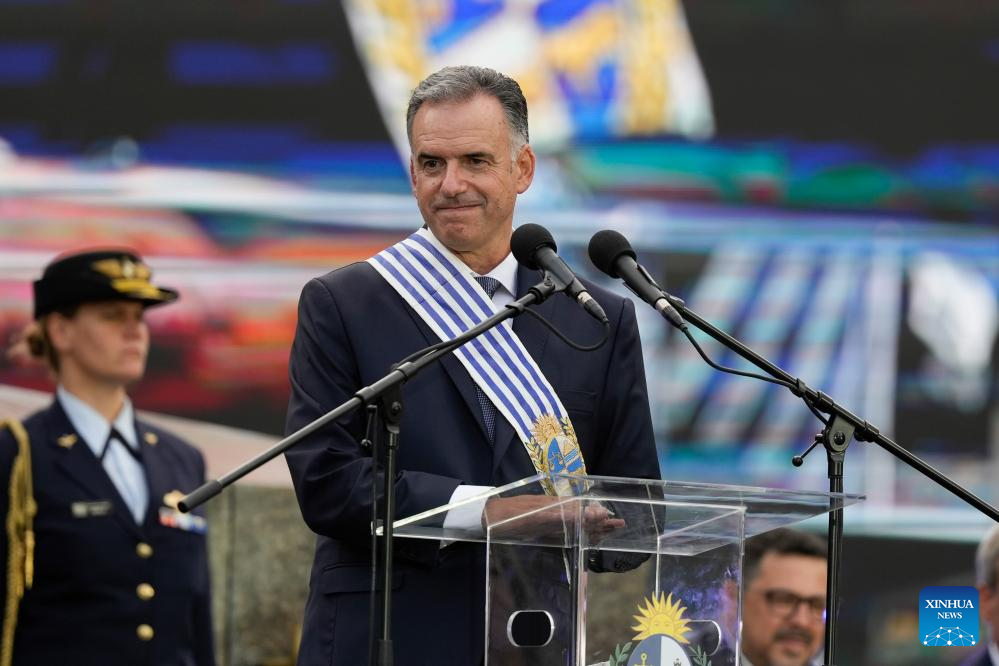El presidente uruguayo, Yamandú Orsi, participa en la ceremonia de cambio de mando en la Plaza Independencia, en Montevideo, capital de Uruguay, el 1 de marzo de 2025. Yamandú Orsi, del izquierdista Frente Amplio (FA), recibió el sábado la banda presidencial como símbolo del Gobierno que inicia para el periodo 2025-2030 convirtiéndose en el 43° mandatario constitucional de Uruguay. (Xinhua/Nicolás Celaya)