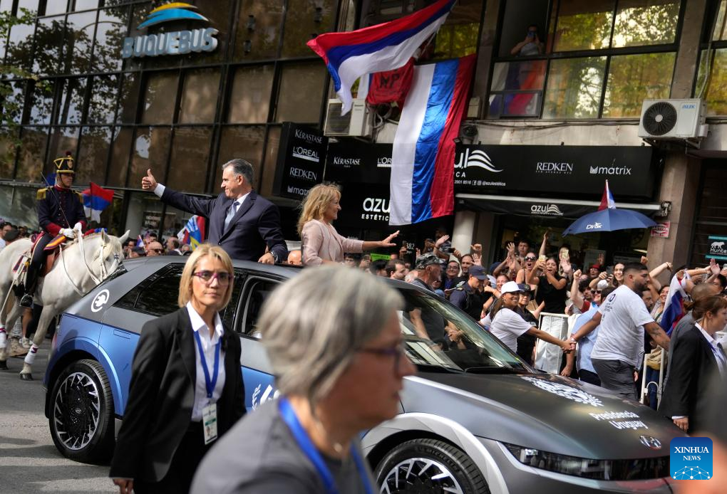 El presidente uruguayo, Yamandú Orsi (i), y la vicepresidenta, Carolina Cosse (d), realizan un recorrido a bordo de un automóvil eléctrico previo a la ceremonia de cambio de mando en la Plaza Independencia, en Montevideo, capital de Uruguay, el 1 de marzo de 2025. Yamandú Orsi, del izquierdista Frente Amplio (FA), recibió el sábado la banda presidencial como símbolo del Gobierno que inicia para el periodo 2025-2030 convirtiéndose en el 43° mandatario constitucional de Uruguay. (Xinhua/Nicolás Celaya)