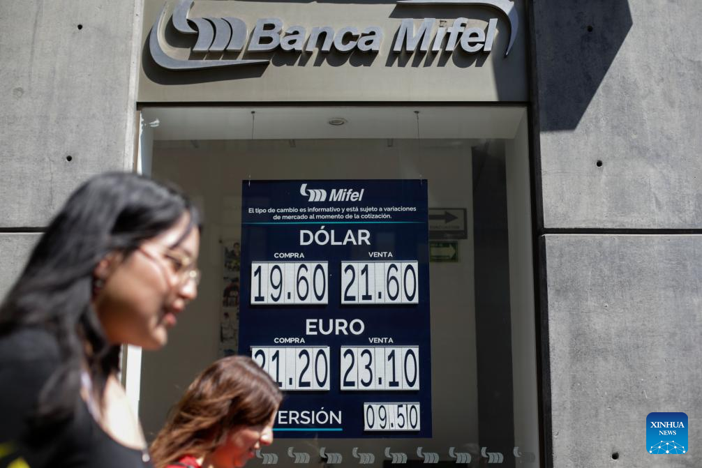 Mujeres caminan frente a un cartel que muestra la cotización del dólar en una sucursal bancaria, en la Ciudad de México, capital de México, el 4 de marzo de 2025. El peso mexicano se depreciaba el martes y rozaba las 21 unidades por dólar estadounidense, ante la entrada en vigor de aranceles del 25 por ciento a las importaciones de productos mexicanos por parte de Estados Unidos, señalaron expertos. (Xinhua/Francisco Cañedo)