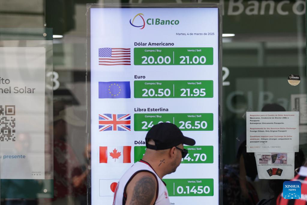 Un hombre camina frente a un cartel que muestra la cotización del dólar en una sucursal bancaria, en la Ciudad de México, capital de México, el 4 de marzo de 2025. El peso mexicano se depreciaba el martes y rozaba las 21 unidades por dólar estadounidense, ante la entrada en vigor de aranceles del 25 por ciento a las importaciones de productos mexicanos por parte de Estados Unidos, señalaron expertos. (Xinhua/Francisco Cañedo)