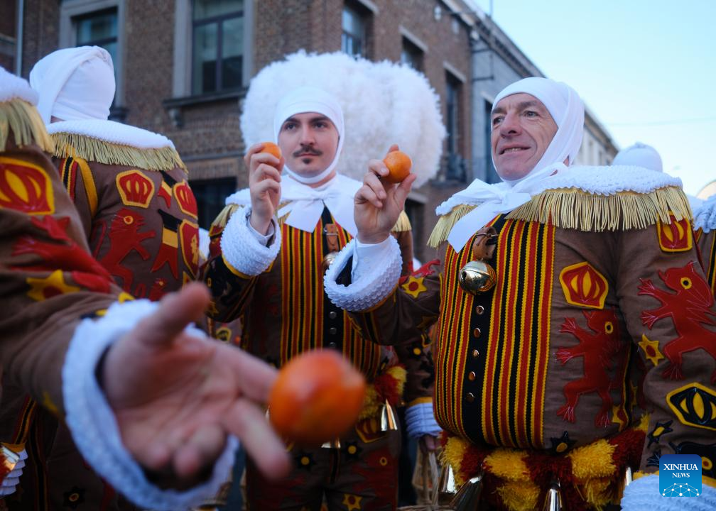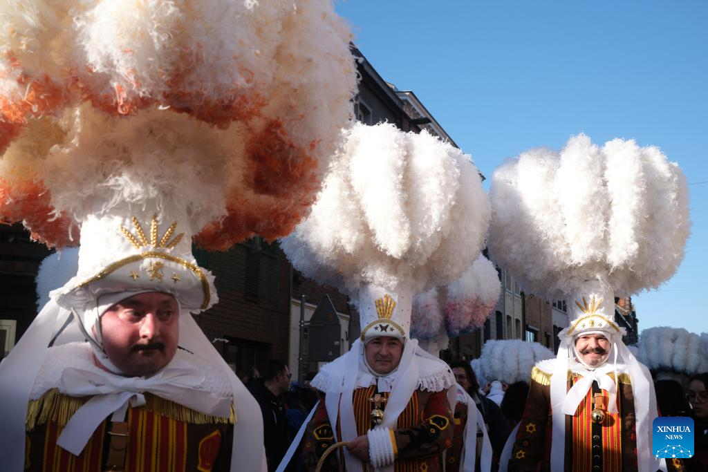 BINCHE, 5 marzo, 2025 (Xinhua) -- Imagen del 4 de marzo de 2025 de personas portando disfraces de "Gille" asistiendo al Carnaval de Binche, un evento Patrimonio de la Humanidad de la UNESCO, en Binche, Bélgica. (Xinhua/Meng Dingbo)