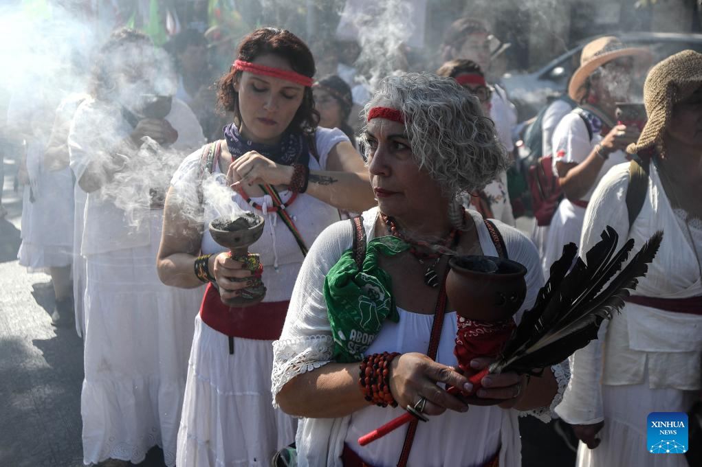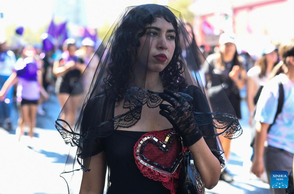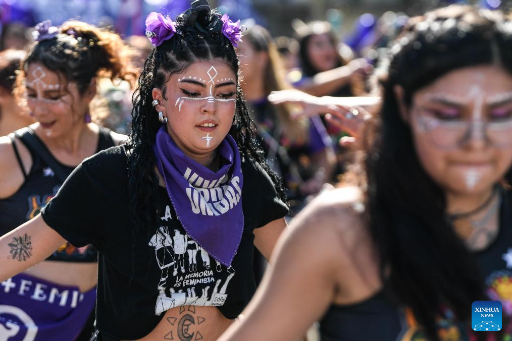SANTIAGO, 8 marzo, 2025 (Xinhua) -- Mujeres participan en una manifestación en el marco de la conmemoración del Día Internacional de la Mujer, en Santiago, capital de Chile, el 8 de marzo de 2025. (Xinhua/Jorge Villegas)