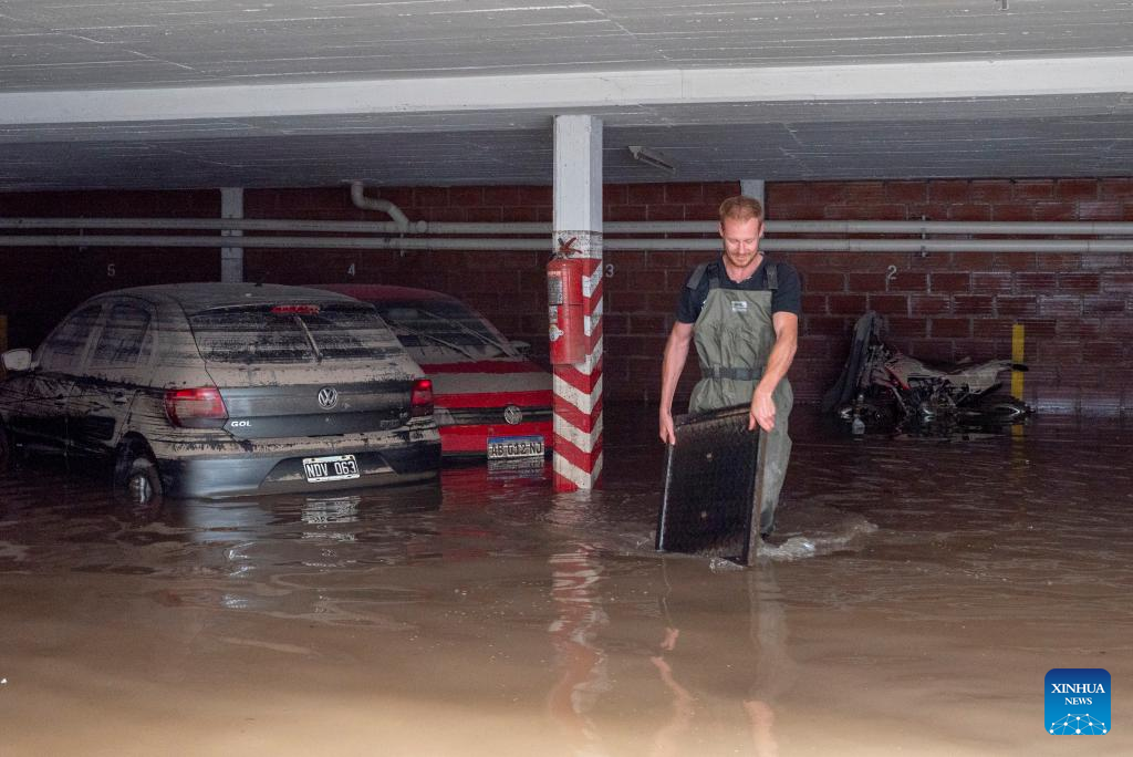 Un hombre trabaja en la extracción de agua de una cochera inundada, en la ciudad de Bahía Blanca, Argentina, el 10 de marzo de 2025. El Gobierno de Argentina anunció el domingo que decretará tres días de duelo nacional por el fallecimiento de al menos 16 personas tras un feroz temporal de lluvias que azotó el viernes la ciudad argentina de Bahía Blanca, a unos 690 kilómetros al suroeste de Buenos Aires. (Xinhua/Str)