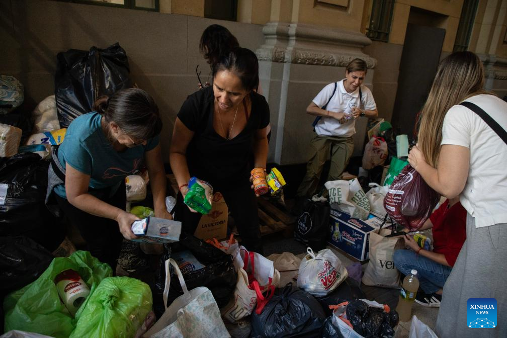 Voluntarias organizan las donaciones recibidas para ser enviadas a la ciudad de Bahía Blanca en el denominado "Tren Solidario", en la estación de trenes de Constitución, en la ciudad de Buenos Aires, capital de Argentina, el 10 de marzo de 2025. Los residentes en Argentina han apelado a la solidaridad para dar una muestra de ayuda material, pero también de afecto y contención a la ciudad de Bahía Blanca, un distrito ubicado 690 kilómetros al sudoeste de Buenos Aires (capital federal) afectado desde el 7 de marzo por lluvias e inundaciones que dejaron al menos 16 fallecidos, más de 1.400 evacuados y cuantiosos daños materiales. (Xinhua/Martín Zabala)