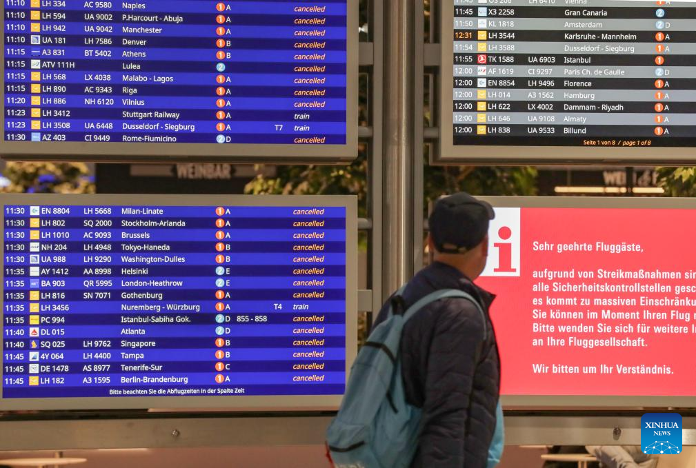 FRANKFURT, 10 marzo, 2025 (Xinhua) -- Un pasajero camina frente a pantallas que muestran la información de los vuelos en la sala de salidas del Aeropuerto de Frankfurt, en Frankfurt, Alemania, el 10 de marzo de 2025. Más de 1.000 vuelos en el Aeropuerto de Frankfurt se vieron afectados por la huelga de trabajadores del aeropuerto el lunes. (Xinhua/Zhang Fan)